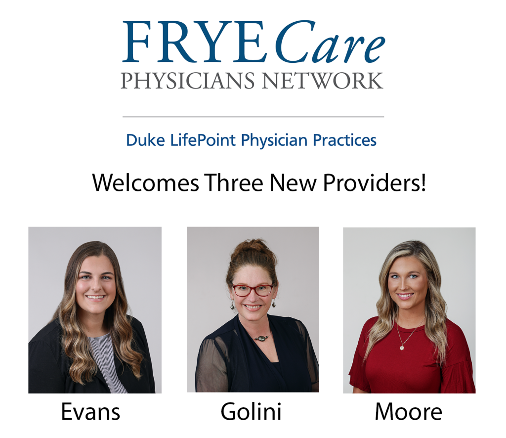 January 20, 2022HICKORY, NC – FryeCare Physicians Network recently welcomed the following advanced practice providers to their new medical offices: Taylor Evans, PA; Sonya Golini, FNP; and Angela Nicole Moore, DNP, FNP. Same-day appointments and online scheduling are available. Taylor Evans, PA, physician assistant, is accepting new patients at FryeCare Women’s…